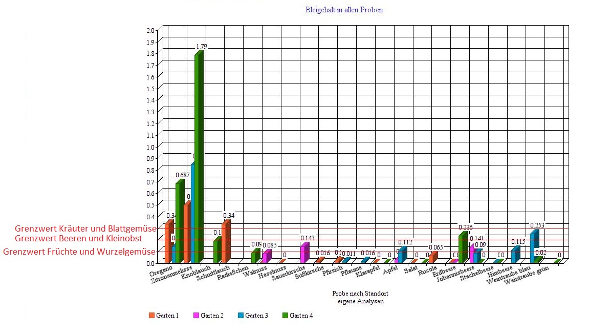 Die Ergebnisse der Untersuchungen zu den Schwermetallgehalten in Pflanzen waren sehr unterschiedlich. Allerdings ließen sich klare Tendenzen erkennen. In einigen Fällen konnten Überschreitungen der Grenzwerte für Lebensmittel nach der „Verordnung (EG) Nr. 1881/2006 der Kommission vom 19. Dezember 2006 zur Festsetzung der Höchstgehalte für bestimmte Kontaminanten in Lebensmitteln“ festgestellt werden. Hiervon waren insbesondere Kräuter betroffen. Zitronenmelisse wies an einem Messpunkt (4) eine fast sechsfache Überschreitung des Grenzwertes für Blei auf. Auch andere Proben von Zitronenmelisse überschritten diesen Grenzwerte von 3 mg/kg deutlich. Es zeigte sich, dass Zitronenmelisse die höchsten Konzentrationen an Eisen enthielt. Das lässt darauf schließen, dass insbesondere Zitronenmelisse Blei und Eisen gut aufnehmen kann. Andere Kräuter, wie z.B. Oregano und Schnittlauch, überschritten ebenfalls den Grenzwert für Blei. Bei Früchten, wie z.B. Sauerkirschen oder Äpfeln, wurden die Grenzwerte für Blei leicht überschritten. Gleiches gilt für Beeren und Kleinobst, wie z.B. Weintrauben und Erdbeeren. Radieschen als einziges Wurzelgemüse der Probenreihe überschritten den Grenzwert für Blei nur leicht. Die Grenzwerte für Cadmium wurden von keiner Probe überschritten. Leicht erhöhte Werte fanden sich nur im Blattgemüse. Für Eisen, da Eisen ein essentielles Schwermetall ist, gibt es keine Grenzwerte. In der Gesamtauswertung ließ sich deutlich erkennen, dass Schwermetalle, insbesondere Blei und Eisen, von Beeren und Kleinobst sowie Kräutern gut gespeichert werden.